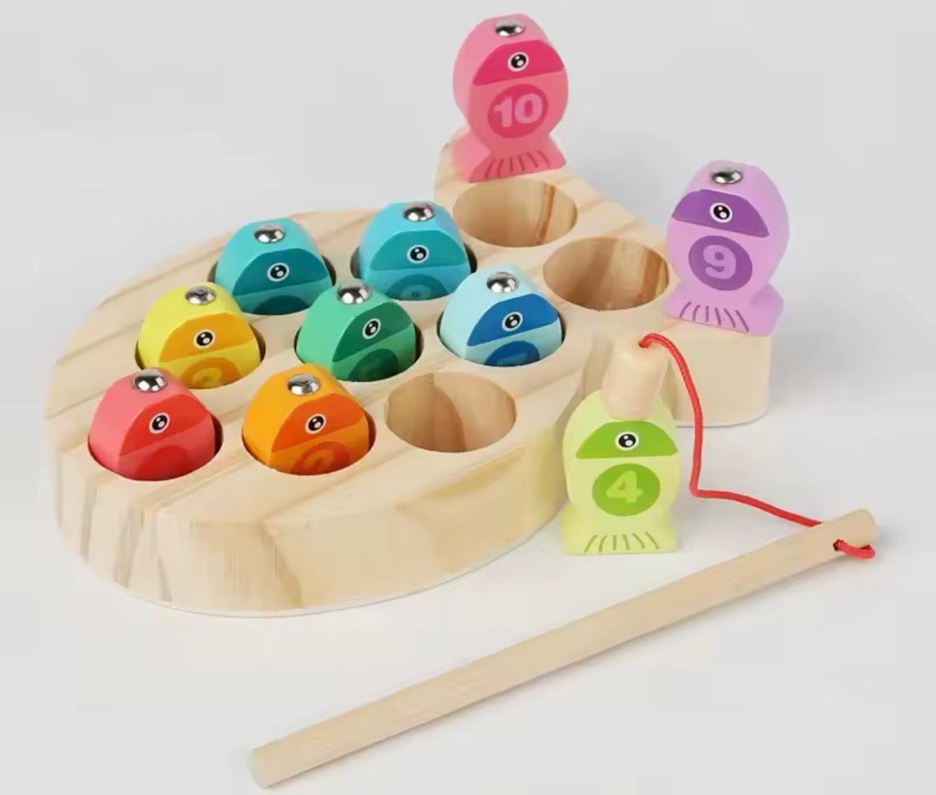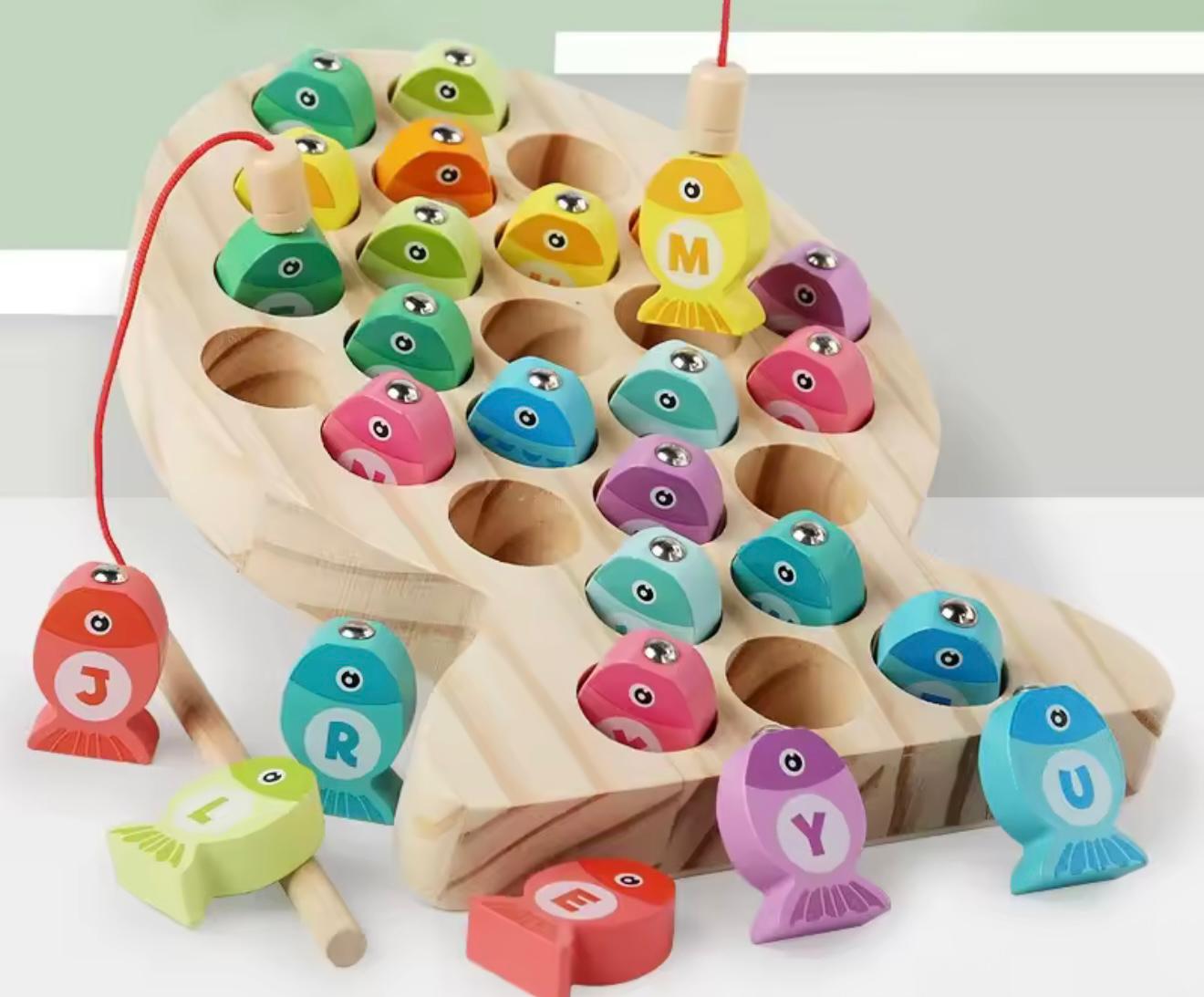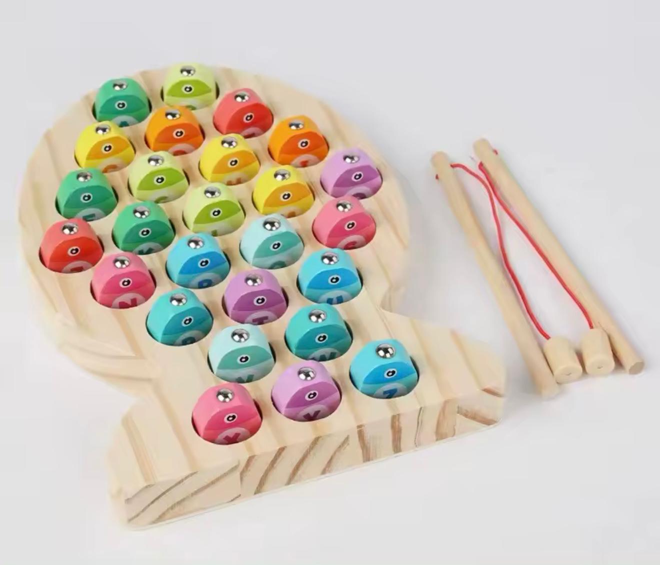 משחק דיג מגנטי צבעוני ואיכותי מעץ, המשלב הנאה, למידה ופיתוח מיומנויות בצורה חווייתית. הילדים משתמשים בחכה מגנטית כדי “לדוג” את הדגים הצבעוניים מהלוח, כל דג מעוצב בצורה ידידותית ומעורר סקרנות. המשחק מעודד ריכוז, קואורדינציה וחשיבה תוך כדי משחק עצמאי או משותף עם ההורים