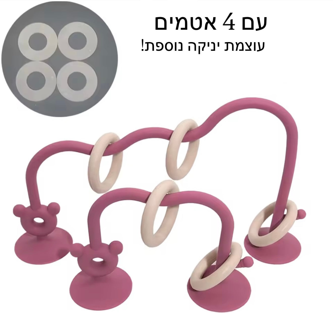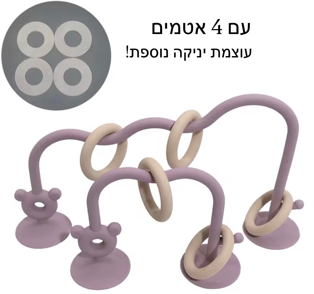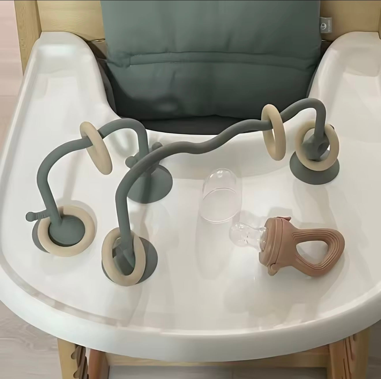 הכירו את הצעצוע שיהפוך כל זמן ישיבה לחוויה של גילוי והתפתחות. מדובר במשחק סנסורי גמיש המעוצב בקשתות עם טבעות למשחק, המצויד בבסיסי ואקום חזקים במיוחד הנצמדים בקלות למגש האוכל, לרצפה או לכל משטח חלק אחר. המשחק מעודד את הסקרנות הטבעית של התינוק, מאפשר תרגול של מוטוריקה עדינה ומספק שעות של הנאה ללא חשש שהצעצוע ייפול או ייזרק לרצפה.