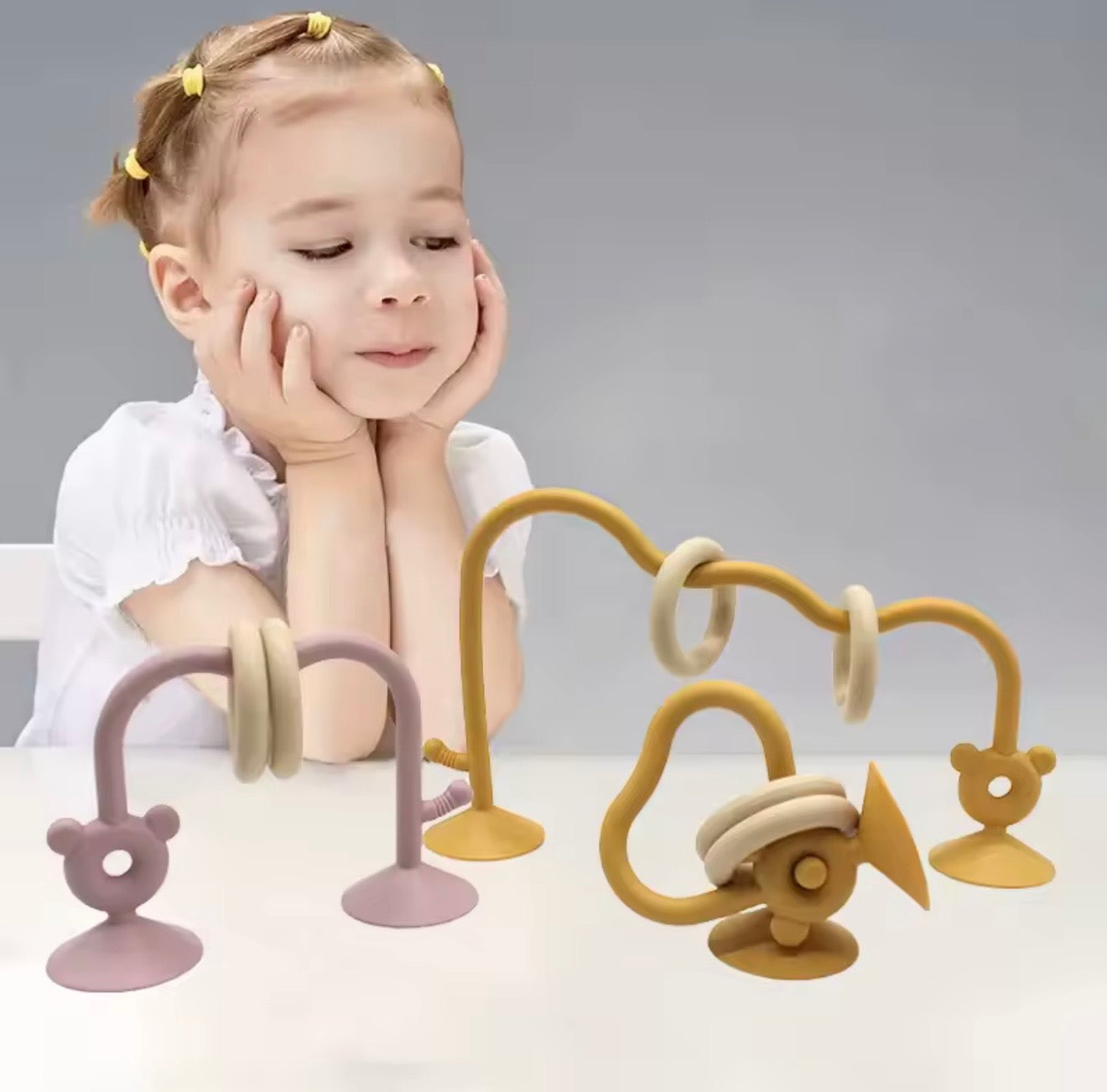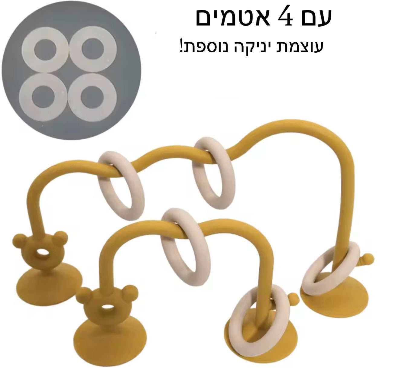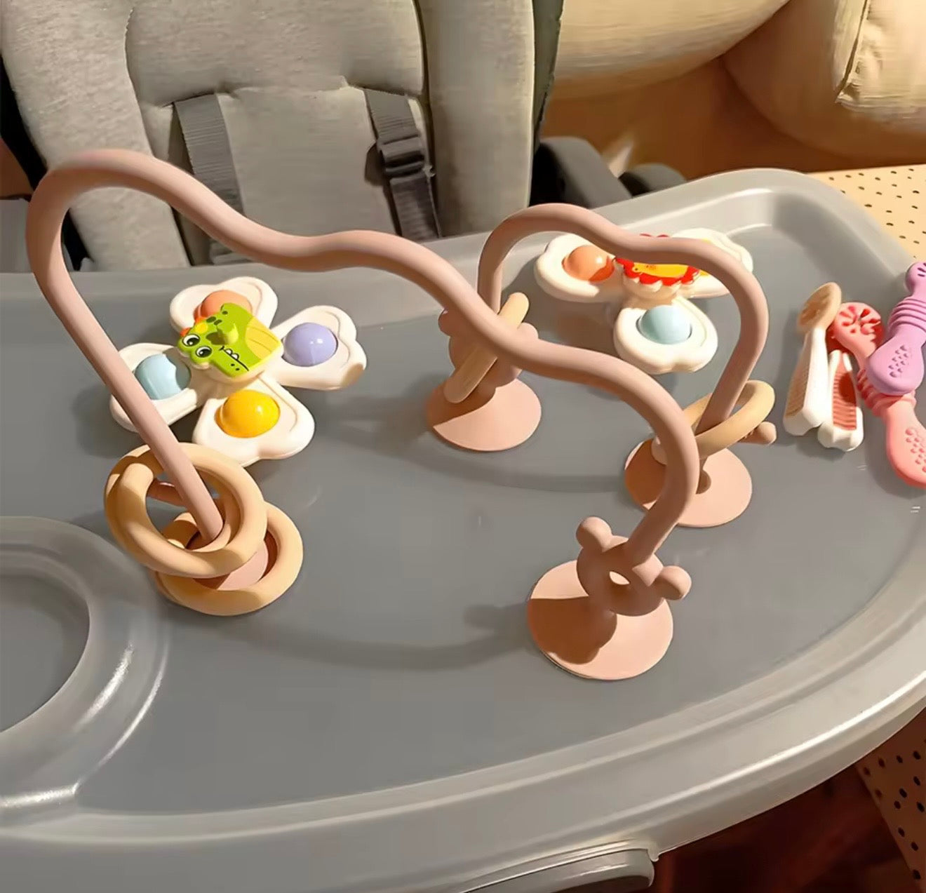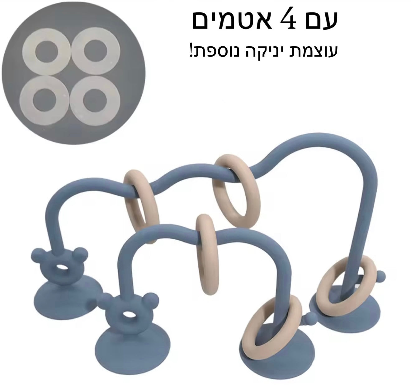 הכירו את הצעצוע שיהפוך כל זמן ישיבה לחוויה של גילוי והתפתחות. מדובר במשחק סנסורי גמיש המעוצב בקשתות עם טבעות למשחק, המצויד בבסיסי ואקום חזקים במיוחד הנצמדים בקלות למגש האוכל, לרצפה או לכל משטח חלק אחר. המשחק מעודד את הסקרנות הטבעית של התינוק, מאפשר תרגול של מוטוריקה עדינה ומספק שעות של הנאה ללא חשש שהצעצוע ייפול או ייזרק לרצפה.